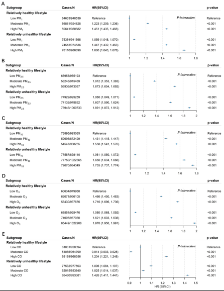 该研究依托超过580万人的超大规模队列数据,系统评估了五种空气污染物(PM₁、PM₂.₅、PM₁₀、O₃、CO)与生活方式对CVD风险的独立及联合影响。研究发现,空气污染和不健康的生活方式均显著增加CVD风险,且在生活方式不健康的人群中,空气污染的危害效应尤为突出。更重要的是,研究进一步揭示了空气污染与不健康生活方式之间存在显著的协同交互作用,二者的叠加效应提升了CVD风险。这一发现为环境与行为因素在CVD发病机制中的交互作用提供了全新的证据。