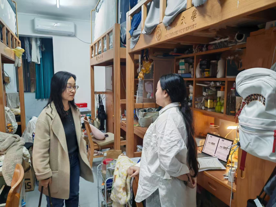 Going deep into the front line to observe the actual situation, and bringing care to the dormitories to warm the hearts of students. Hao Yajuan, the secretary of the Party Committee of Zhongshan School of Medicine, Wang Shuzhen, the researcher and vice - dean, Chen Baoyu and Chen Yanping (on secondment), the deputy secretaries of the Party Committee, as well as the counselors of all grades and the representatives of class teachers jointly participated in the visit to the dormitories. They had heart - to - heart talks with the students, cared about the students' adaptation to the new semester, and encouraged the students to study hard, practice what they have learned, live a healthy life and achieve all - round development in the new year.