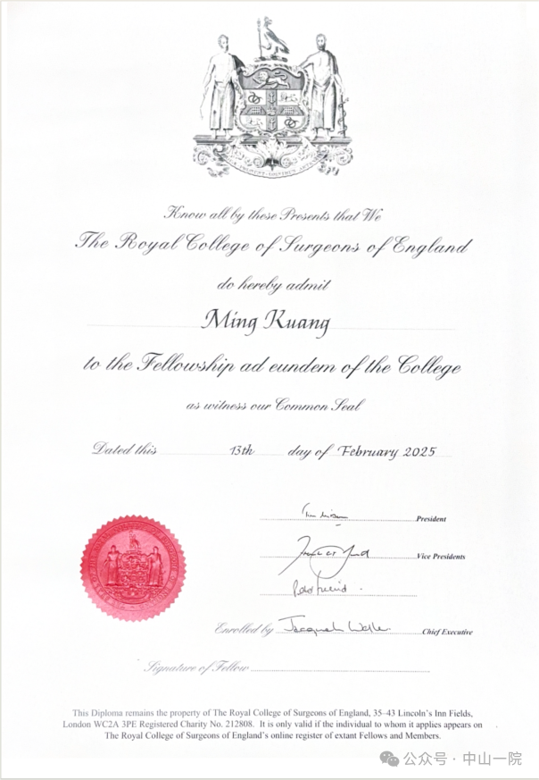 On July 9th, Professor Kuang Ming—Vice President of the First Affiliated Hospital of Sun Yat-sen University, Academic Leader of the Hepatobiliary and Pancreatic Surgery Center, and Dean of the College of Basic Surgery—officially received the "Fellow of the Royal College of Surgeons (FRCS)" certificate from Professor Tim Mitchell, President of the Royal College of Surgeons (RCS), at the RCS headquarters in England.