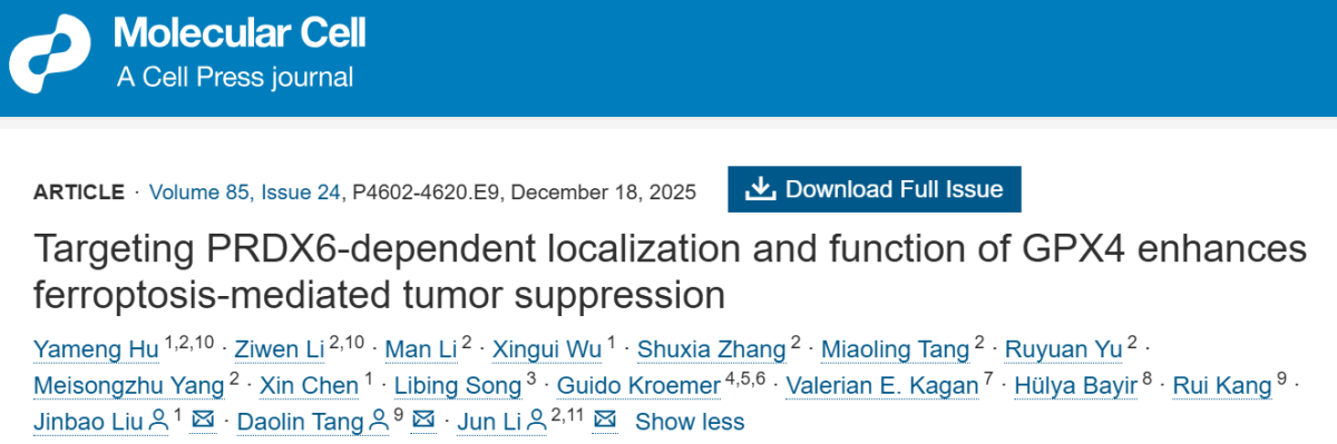 李隽教授、广州医科大学刘金保教授与美国德克萨斯大学唐道林教授团队合作,在Molecular Cell上发表了题为Targeting PRDX6-dependent localization and function of GPX4 enhances ferroptosis-mediated tumor suppression的研究成果。该研究系统揭示了过氧化还原酶6(PRDX6)介导的铁死亡防御机制,阐明了其结合并携带GPX4蛋白上膜促进细胞膜磷脂过氧化损伤修复,进而诱导肿瘤细胞铁死亡逃逸的作用机制,为靶向癌症治疗提供了新思路。