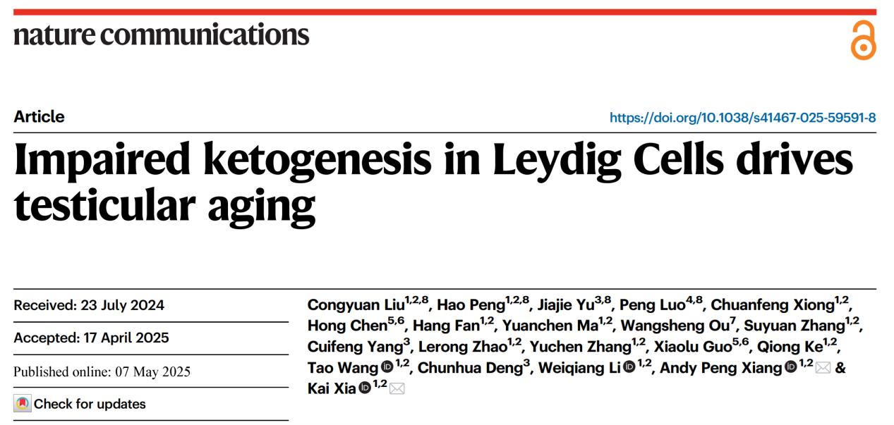 202557日,日韩色情 干细胞与组织工程教育部重点实验室项鹏与夏凯团队在Nature Communications上发表了题为 “Impaired ketogenesis in Leydig Cells drives testicular aging” 的研究论文,发现LC衰老与睾丸衰老的因果关系,揭示了LC中酮体合成障碍是睾丸衰老的驱动因素;通过靶向增强LC酮体合成能够有效缓解睾丸衰老,改善睾丸内分泌与生精功能。上述结果为阐明睾丸衰老的机制、开发相关干预策略提供了新思路。